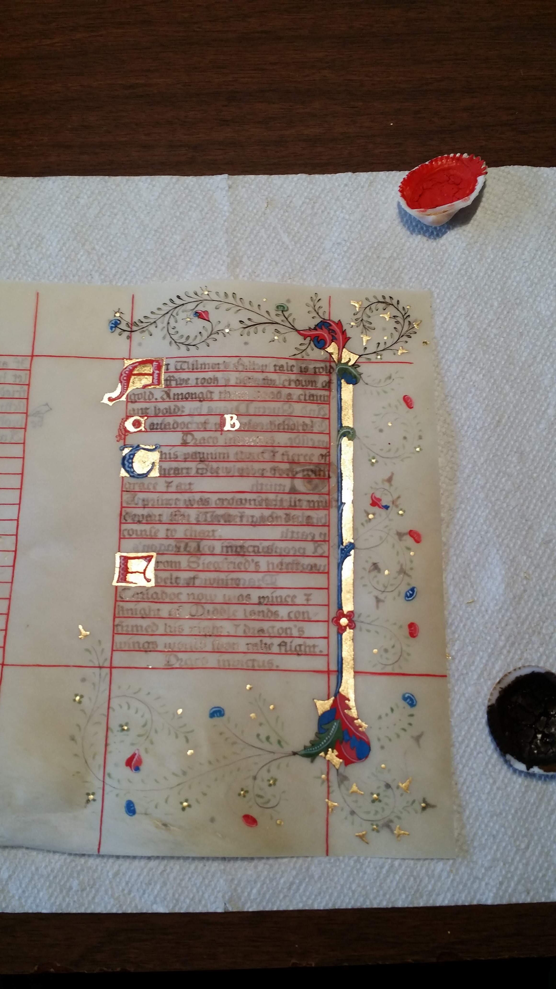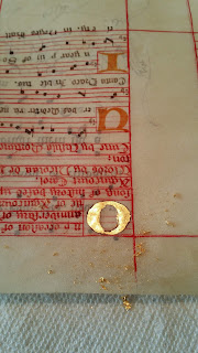 Preparing the gold leaf; as with the rest of the book, we were not to use modern adhesives. Behind the leaf, you can see a tiny jar of garlic juice.