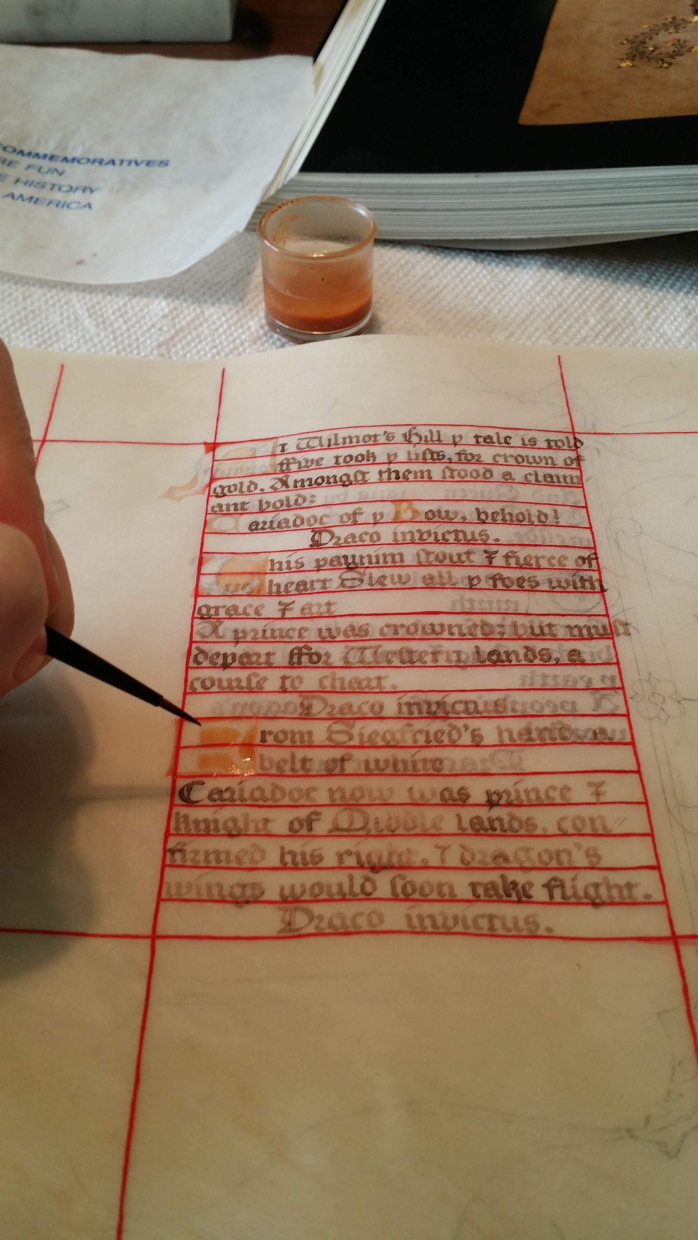 Painting the guidelines onto the vellum, without a ruler; if you look closely, you can see where I scraped off the leftmost line because I got the spacing incorrect on it.