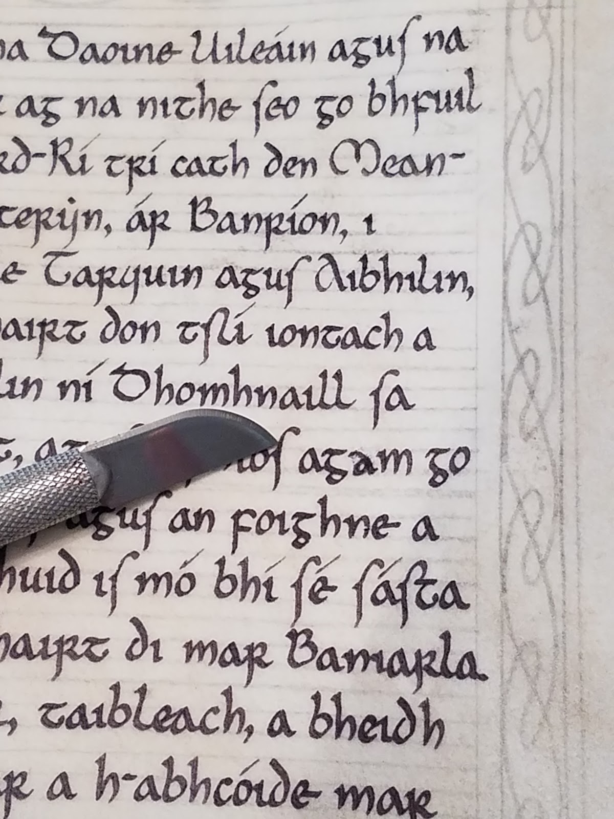The handle is just a standard Exacto knife. Exacto makes scalpel blade refills that you can get in most craft stores. They are a better shape for scraping errors like this, cutting quills into pens, and other period activities. The famous triangular blade is still acceptable! But the scalpel blades work better if you can get them.